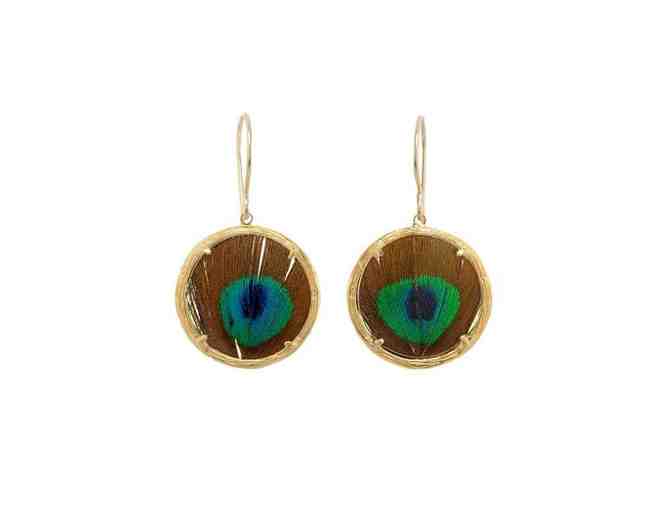 The natural beauty of a peacock feather - its bold, iridescent colors and unmistakable silhouette - is captured in still life inside this two-sided glass chamber. The earrings is subtly enhanced by a frame of organically styled, softly textured branches. Held like a precious talisman, these lustrous feathers bring vitality wherever they go. Handmade in Hawaii.