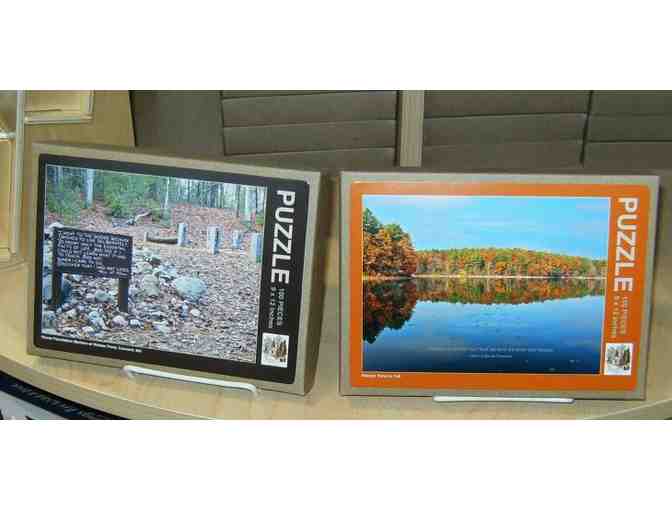 Two 100-piece Walden Pond jigsaw puzzles from The Shop at Walden Pond. Both feature full-color photographs by Barbara Olson. One is of Thoreau's Walden house site, with its tribute cairn. The other is a view of Walden Pond in full fall color. Each one contains 100 pieces and finishes to 9 x 12 inches. And both can be tricky to put together!