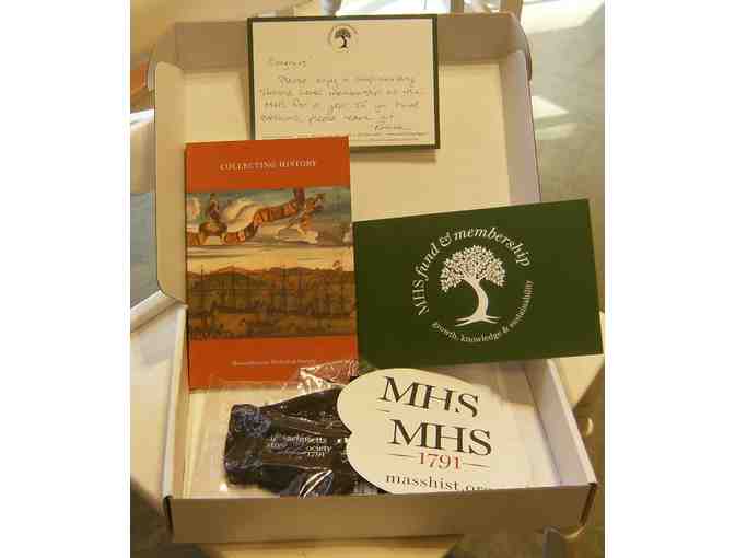 Massachusetts Historical Society, Steward Level Membership for one year (a $250-999 value). This welcome box includes two oval magnets, two face masks, printed material, and a free copy of the 2009 book, Collecting History.