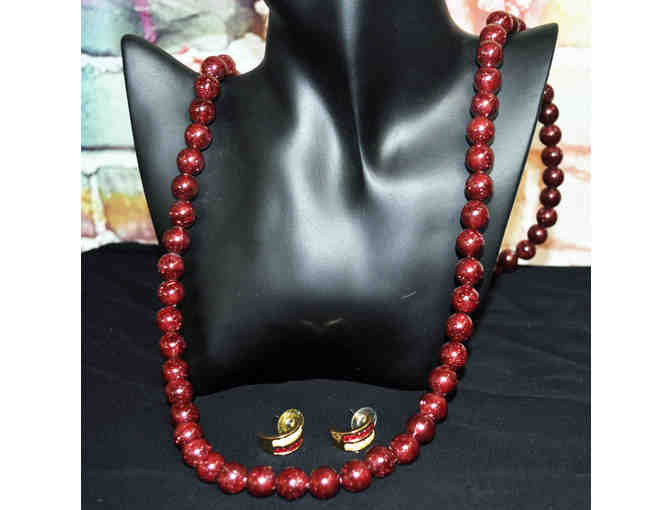 Maroon Resin Beaded Necklace 36" and Gold Colored Post Ear Hugger Earrings