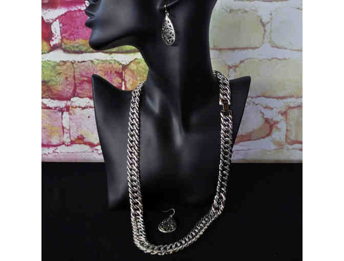Silver Colored, Large Link Chain and Tear Drop Silver Colored Earrings