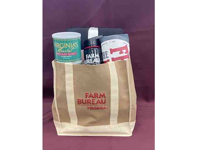 Enjoy a Virginia Farm Bureau (VFB) tote bag, Friend of the Farm XL T-shirt, VFB water bottle, waterproof blanket perfect for the park or a ball game and 3 cans of VA peanuts (chocolate covered, butter toasted and salted).