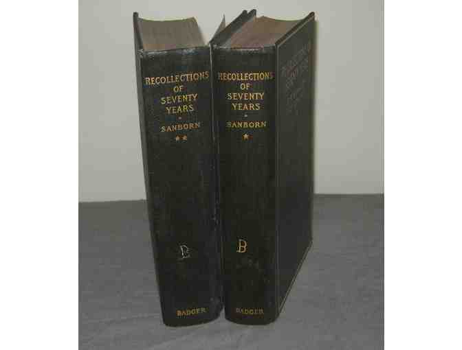 Recollections of Seventy Years, by F. B. [Frank] Sanborn. In two volumes. Richard G. Badger, 1909. Sanborn knew the Transcendentalists and was also a member of John Brown's Secret Six. Black cloth volumes with gilt decoration and letters, as well as gilt top edges. An ex-library copy with a few marks. Pages are only slightly aged. This is a nice set of Sanborn's memoir.