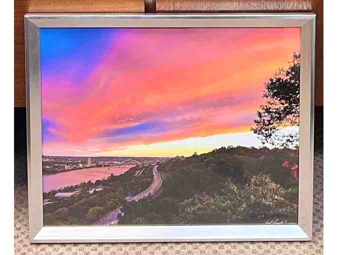 Cincinnati Skyline at Sunset framed photograph by Cincinnati photographer, Dr. G. Rusty Frankel. Silver frame, approximately 21.24" W x 17.25" H.
