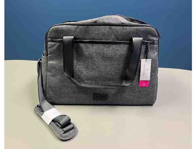 Travel in style with this Vera Bradley ReActive Weekender Bag in Gray Heather and Teema Towel & Blanket in The Grey Layers. The weekender bag, which also can be used as a briefcase or gym bag, features three large zippered compartments and several interior and exterior slide pockets including a trolley slip. Made from recycled plastic bottles, the bag is lightweight and water repellent. It is carry-on compliant and comes with a removable, adjustable padded shoulder strap.