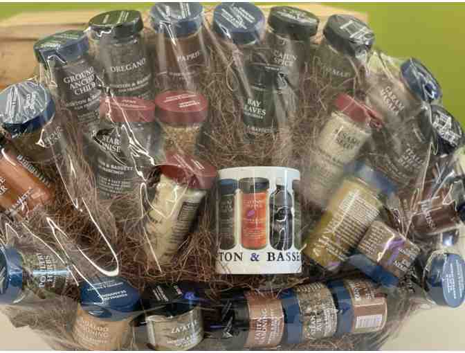 This wood basket is full of 25 cooking spice bottles (including chopped garlic, chili powder, oregano, paprika, ground cinnamon, curry, and MORE!), a mug, and a green cooking apron!