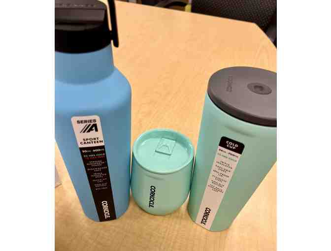 Enjoy this basket of Corkcicle goodies, including a 24-oz. Cold Cup in Sun-Soaked Teal, a 12-oz. Stemless Wine Cup in Sun-Soaked Teal, and a 20-oz. Sport Canteen in Santorini. Get ready for summer sipping!