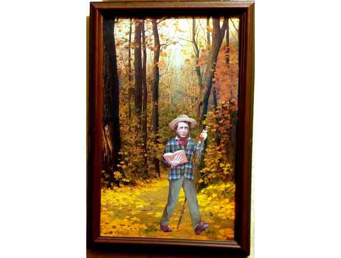 This colorful framed artwork combines an Unemployed Philosophers Guild Henry David Thoreau card, and an art print of "Woman Walking a Forest Trail" by Vasili Dimitrievich Povenove. This framed artwork measures 11 x 18 inches. Museum glass is in the frame to help protect the print from fading.