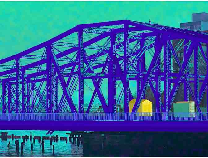 The lovely bones of Boston's Northern Avenue Bridge, situated in Fort Point Channel between the Moakley Courthouse and the Barking Crab, have long captured the public’s imagination. During the 106 years that it was operable, it swung open from its center to let water traffic pass. The bridge was closed in 2014. Boston artist Paula Ogier pays tribute to its unusual beauty in her digitally painted photograph.