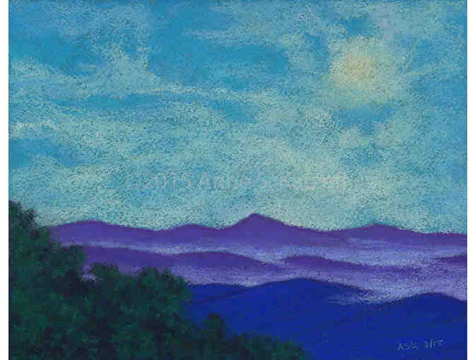 This pastel painting by Anne Katzeff was inspired by watching the calming morning mist float near the peaks in the Blue Ridge Mountains of Asheville, North Carolina. The original artwork measures 10 x 8 inches. With the mat, it measures 11 x 14 inches.