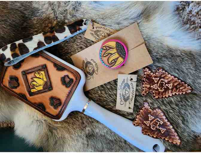 Snag these hand-made custom leather items created in the great state of Kansas! Accessories include a leather-back hair brush with sunflower detailing, a pair of leather arrowhead earrings with bison imprint, a sunflower leather popsocket and a cowhide wristlet keychain.