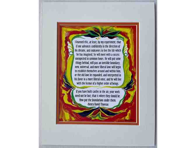 This colorful 11 x 14 inch matted print depicts the long-version of the quotation by Henry David Thoreau, "I learned this, at least, by my experiment, that if one advances confidently in the direction of his dreams ..." It's ready to frame as wall art for any home or office. Designed and offered by Raphaella Vaisseau.