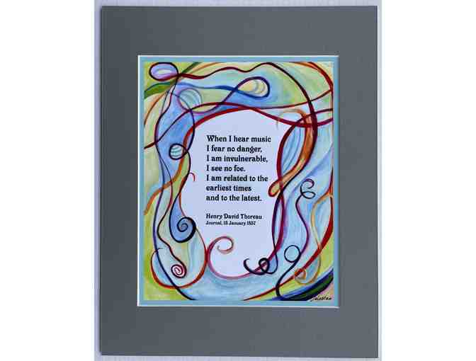 This colorful 11 x 14 inch matted print depicts the quotation by Henry David Thoreau, "When I hear music I fear no danger, I am invulnerable, I see no foe. I am related to the earliest times and to the latest." It's ready to frame as wall art for any home or office. Designed and offered by Raphaella Vaisseau.