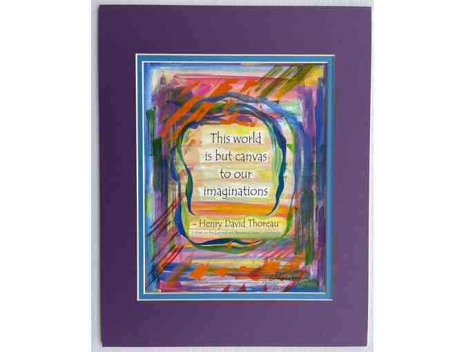 This colorful 11 x 14 inch matted print depicts the quotation by Henry David Thoreau, "This world is but canvas to our imaginations." It's ready to frame as wall art for any home or office. Designed and offered by Raphaella Vaisseau.