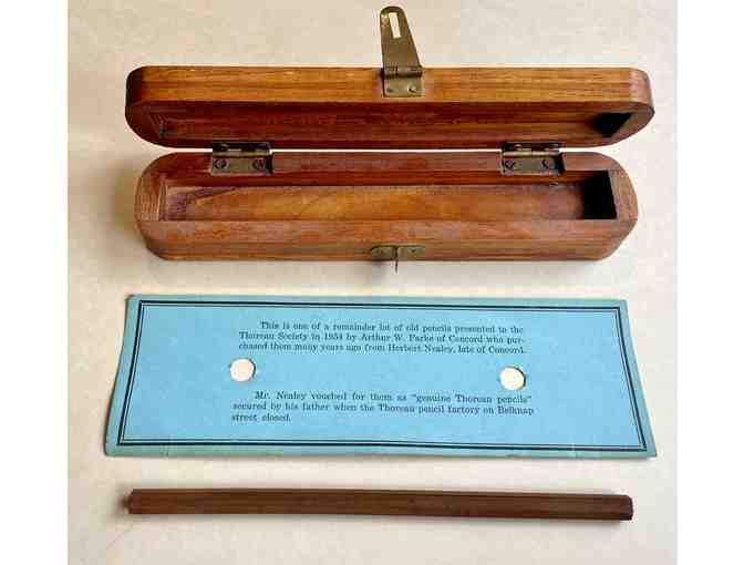 This is one of a remainder lot of old pencils presented to the Thoreau Society in 1954 by Arthur W. Parke of Concord, who purchased them many years ago from Herbert Nealey, late of Concord. Mr. Nealey vouched for them as "genuine Thoreau pencils" secured by his father when the Thoreau pencil factory on Belknap Street closed. Accompanied by a wooden presentation box, and a card of provenance.