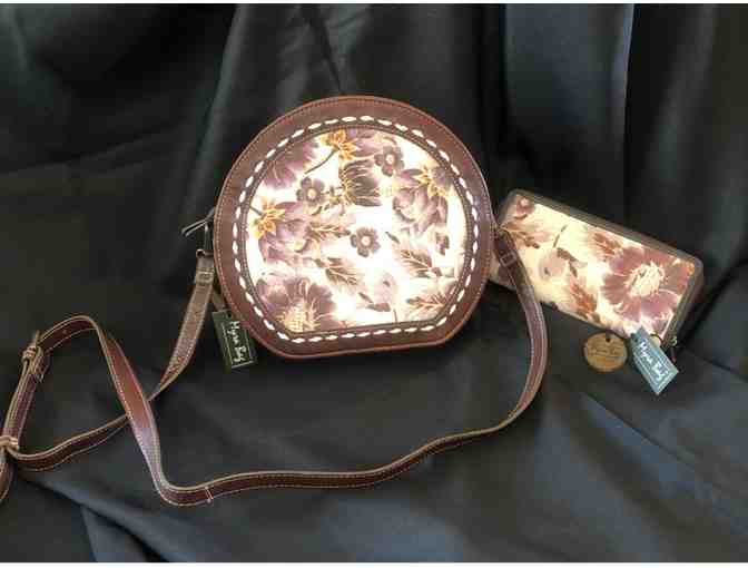 Myra upcycled Canvas & leather Bag & Wallet to match!Bag features canvas surounded by laced leather on the outside & cowhide in the center. Wallet zips on 3 sides with credit card pockets on 2 sides & zip coin purse in center.
