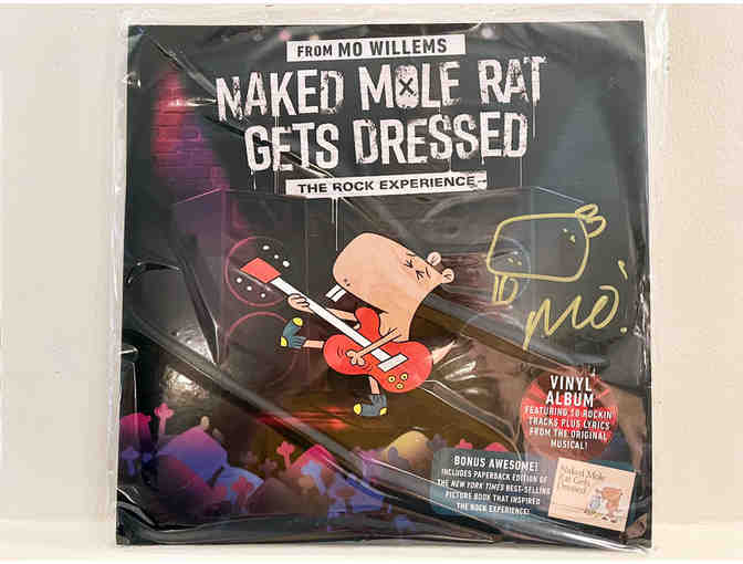 Vinyl record and paperback book for The Naked Mole Rat Gets Dressed: The Rock Experience, signed with an illustration from bestselling author Mo Willems.