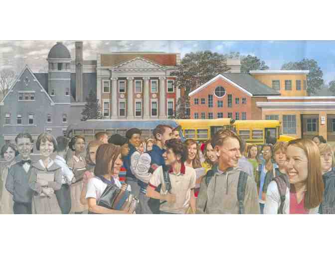 Signed print of CF Payne's History of Wyoming High School. This is a print of the mural in the entrance lobby of the Wyoming High School. Chris Payne is a renowed American caricaturist and illustrator who is also a 1972 WHS Graduate.