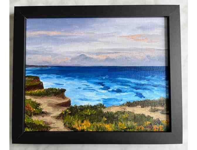 Beautiful framed 8x10" original oil painting featuring a serene oceanside scene by local painter Linda Engstrom.