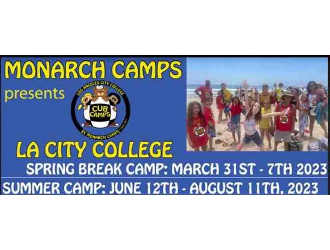 Need summer coverage for your kid 5+? Cub Camps is a blast! Monarch Camps provides campers with a fun and enriching environment where growth is a natural outcome of participation. The sports and activities we offer facilitate the development of cooperation, creativity, motor skills and sportsmanship among campers. Camp traditions and inclusion are tools that we use to cultivate a family environment. We strive to be a positive influence on a camperÂÂÂs growth from childhood through their teen and adult years. Being a leading day camp in Los Angeles, California since 1971 has allowed us to perfect the art of delivering a kid-friendly and parent-approved experience across all of our services. Operating on LA City College campus of 35 acres, our facility includes an aquatics complex, two indoor gymnasiums, a soccer field, a running track, tennis courts, recreation rooms for exciting science lessons and experiments, a performing arts area, and THE BEST COUNSELORS EVER!