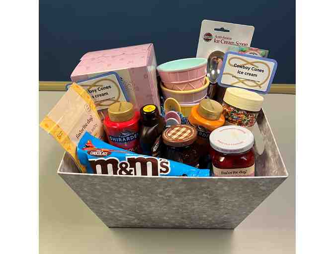 Basket filled with everything you need to have an ice cream party. Also includes two $20 gift cards to Cowboy Cones! Basket includes: