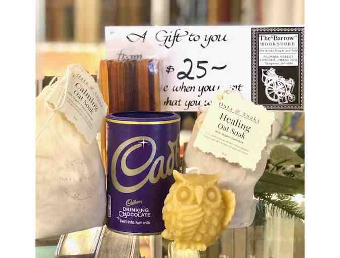 Collection includes: $25 Gift Certificate to Barrow Bookstore, (2) Oats & Soaks bath soaks (Calming Oat Soak with Organic French Lavender, and Healing Oat Soak with Organic Calendula), Cadbury Drinking Chocolate, Assortment of Honey Sticks, and pure Beeswax Owl Candle.