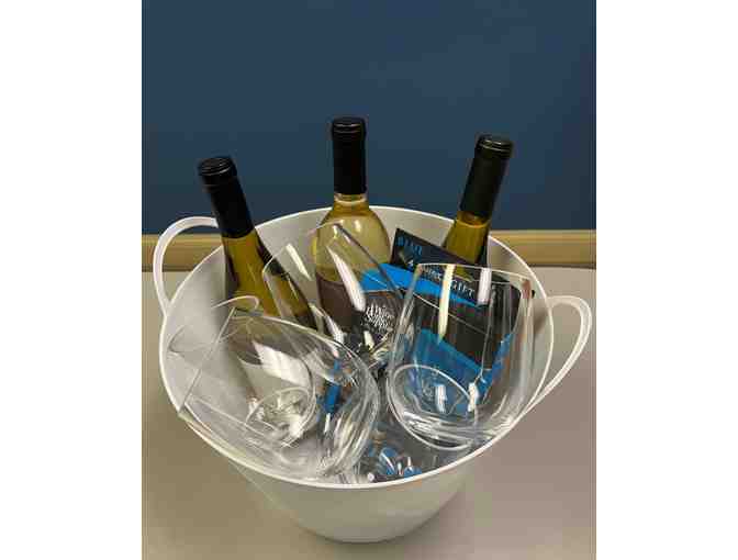 White plastic tub filled with three bottles of white wine, four-piece wine gadget gift set, and six acrylic stemless wine glasses.