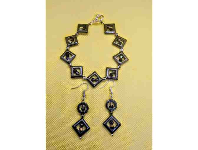 9 inch triangle hematite bead bracelet and earring set with chrome seed beads and silver lobster clasp.