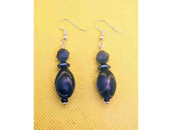 Blue with gold shimmer glass bead earrings topped with lapis gemstone beads