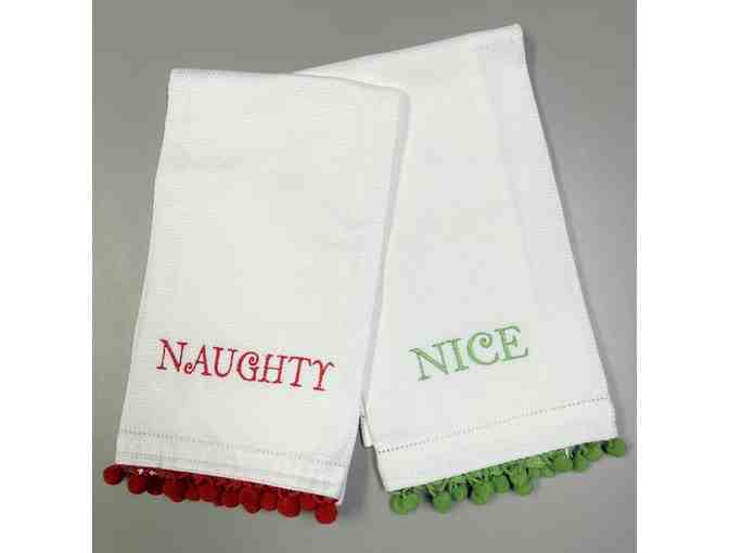Naughty & Nice embroidered hand towels with pom pom trim. White hemstitch towels have a subtle diamond pattern to the weave, are 100% cotton, very absorbent, lint free, and approximately 16" W x 21" H. These towels are perfect kitchen towels and dressy enough for the bath as a fingertip or guest towel.