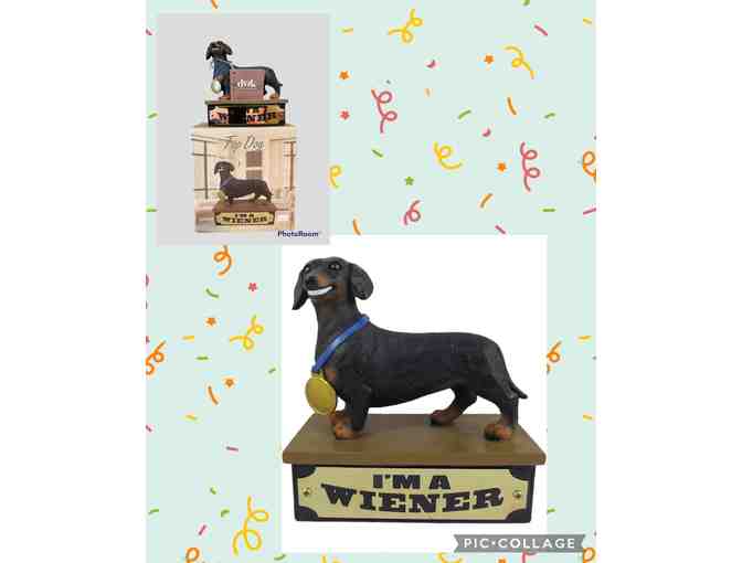 Hand painted polyresin material. Measures to 5.5" x 6". Cute sculpture of a dachshund dog trophy with the words "I'm A Wiener" on a plaque.