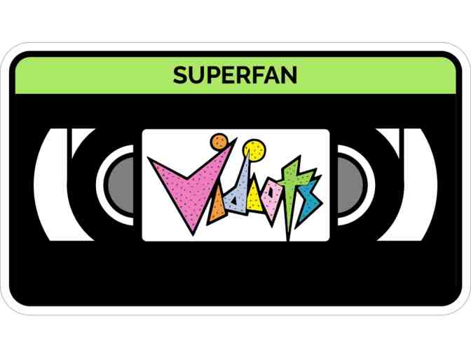 Vidiots "Superfan" Annual Membership for their inaugural year (membership benefits start when they open), along with some fun merchandise (t-shirt, socks and stickers). Some perks of the Superfan Membership include invitations to members-only screenings, access to ticket pre-sales, $3 discounts on tickets to regular screenings, and free video store rental on your birthday!