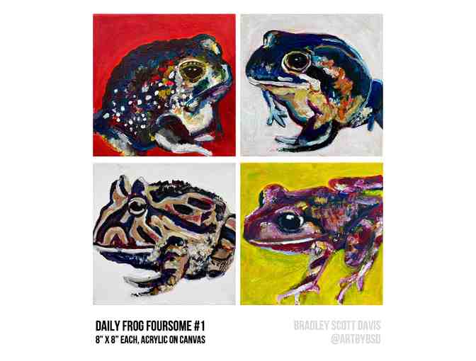 Winning bidder will choose one set of the four "Daily Frog Foursomes". Each "Daily Frog Foursome" includes four 8" X 8" frog acrylic paintings on Canvas (foursomes can not be split up). The artist is Bradley Davis.