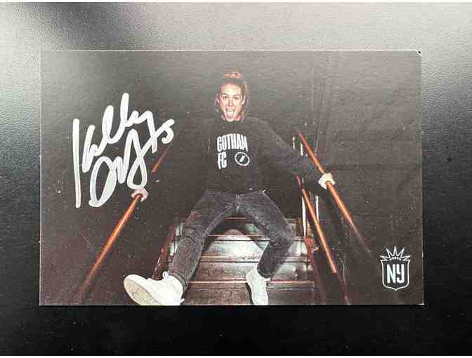 A postcard signed by Kelley O'Hara of her announcement as the first-ever free agent signing in league history.