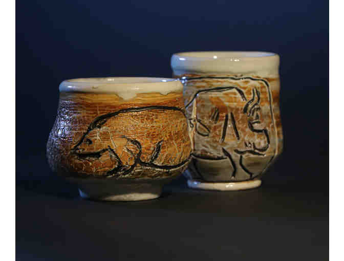 The second vessel is adorned with a bison image and stands 3" tall.