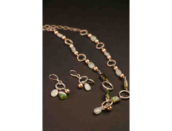 This stunning necklace and earrings set by Erica Clark is perfect for spring. Made of Czech glass Picasso beads, glass pearls, aquamarine, and silver.