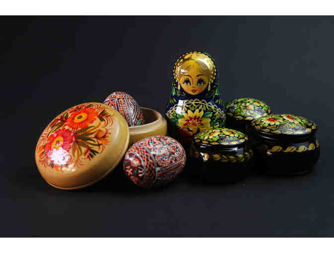 A charming collection of decorative items from Ukraine including four little boxes, wooden eggs, and some adorable stacking dolls.