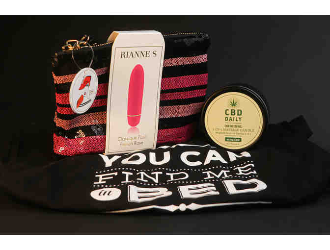 This tempting package from Early to Bed comes with a totebag, personal massager, CBD Daily massage candle, some Early to Bed swag, and a $50 Early to Bed gift certificate for any extras you might desire!