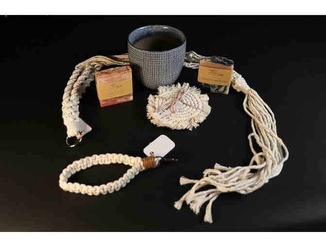 Amanda has generously donated some of her amazing macramé to the auction and it has been paired with some fun soap from Light + Love Soaps and a cute little planter. You'll get: