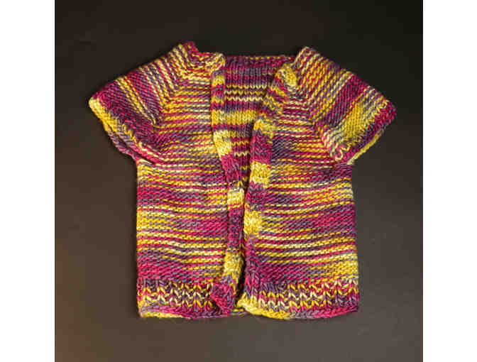This adorable and colorful shrug was hand-knitted by Mac Grambauer. It is so cute and soft that it's a shame it isn't for adults!
