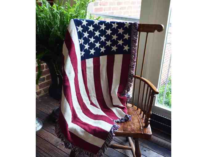 This 5' x 3' fringed woven throw is patterned after the symbol of our country-the American Flag. On one side, the flag appears like a traditional flag with all 50 stars in white on a field of blue, while the rest of the flag is red and white stripes. When the throw is reversed, the stars are on a field of red, and the stripes are blue and white. Machine washable, 100% cotton, made in the USA.