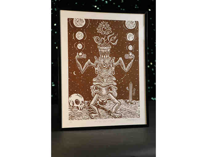 A charming and slightly weird (that's OK, we love weird) linoleum relief print by Chicago artist Miguel Lopez. Entitled, El Mago del Desierto, this piece is printed on Stonehenge paper, numbered, signed, and framed.