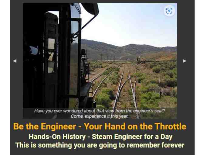You are bidding on a certificate to Be The Engineer of a Steam Locomotive at the Nevada historic landmark Railway.