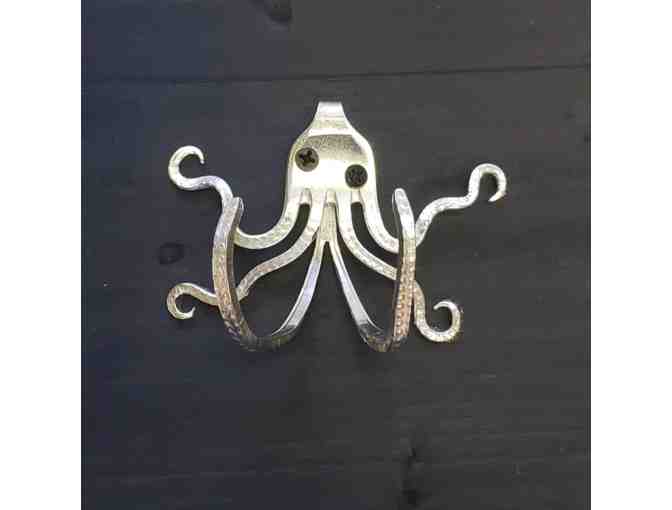 A handcrafted Octopus wall hook made from a vintage European continental silverplate table fork. Comes with two black wood screws, which form the 'eyes' of the octopus and allow you to mount it on any wood surface.