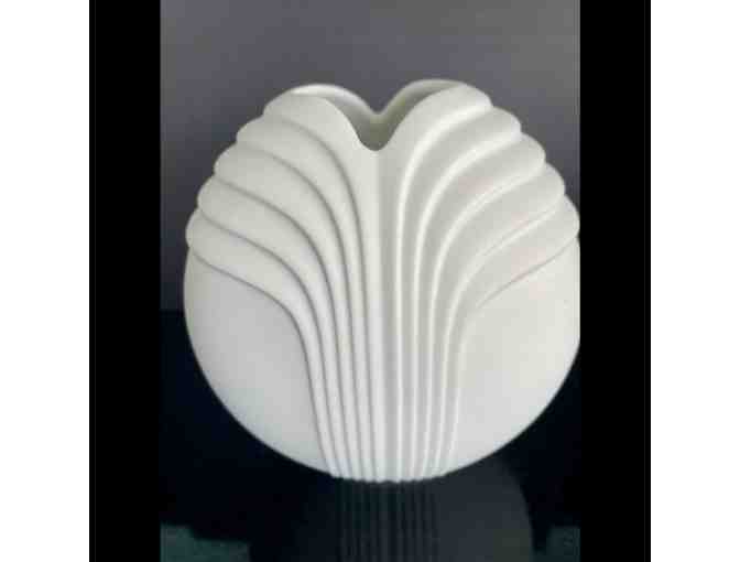 Vintage Studio-Linie Rosenthal (Germany) white matte art deco style oblong/rounded vase. A little over 4.75" both tall and wide. One very tiny 1/8" thin mark on one side (looks more pronounced in photo). But overall excellent condition. Studio markings and faintly imprinted number on bottom. Photos show both front, back, side," and bottom.