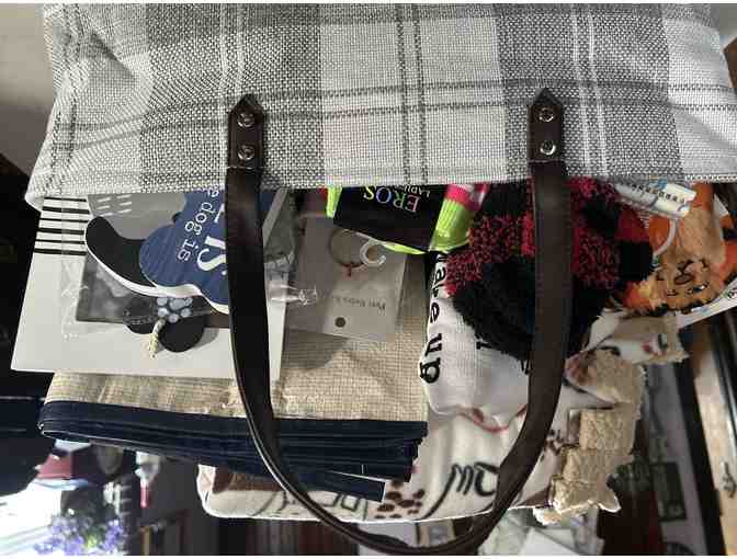 Plaid storage bag full of dog items and ones for the humans who love them.