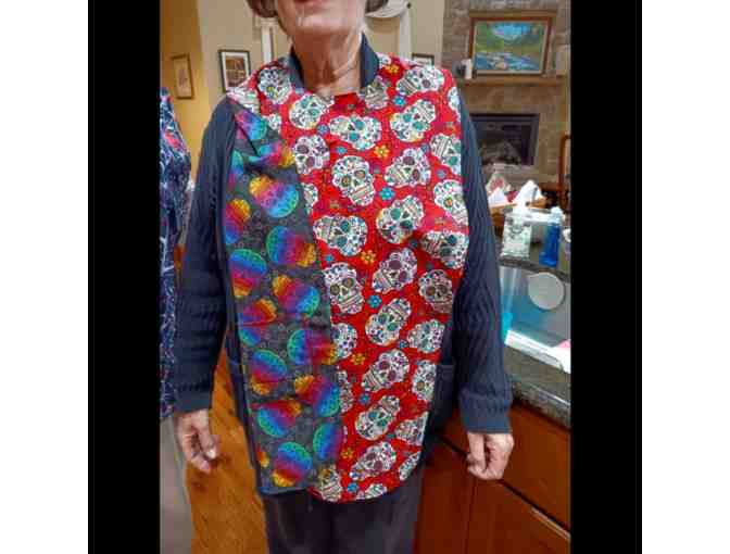 One size fits most. Clothing protector is dual sided and is meant to protect clothing from stains. My mother was the inspiration. It's made of cotton can be machine washed cold line dry or delicate dry.
