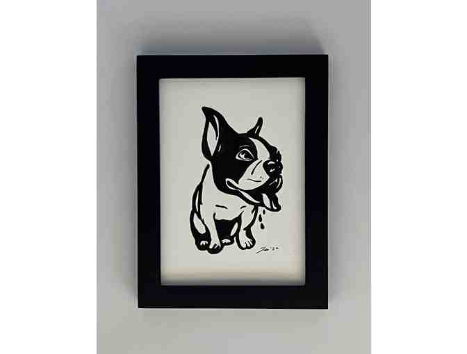 Description: This is a framed handmade portrait of a Boston Terrier. The piece measures 6x8in with the frame and 5x7in without the frame. The frame is included with the artwork. Medium: archival ink on 140lb watercolor paper
