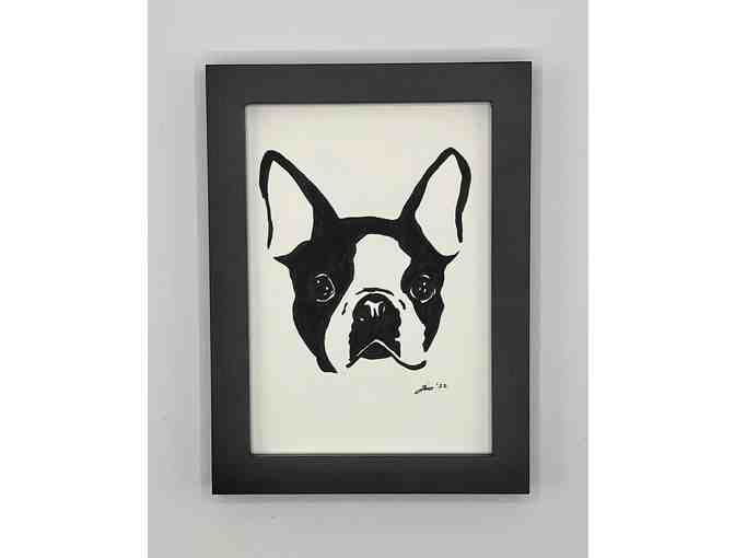 Description: This is a framed handmade portrait of a Boston Terrier. The piece measures 6x8 with the frame and 5x7 inches without the frame. The frame is included with the artwork. Medium: archival ink on 140lb watercolor paper