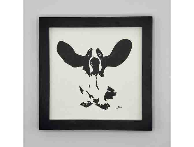 Description: This is a framed handmade portrait of a Bassett Hound with flying ears. The piece measures 9x9" with the frame and 8x8" without the frame. The frame is included with the artwork. Medium: archival ink on 140lb watercolor paper